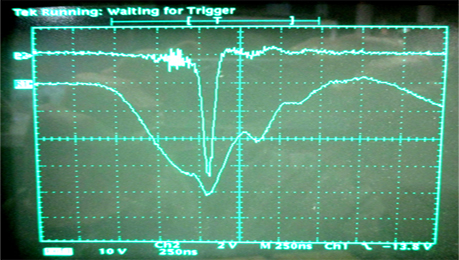 By contract we aren’t allowed to give too many details, but the photos give an idea of what we are doing. It shows a voltage pulse across one tube and the current drawn as it produces a megawatt in just 90nS at 3-5GHz. We are working on even higher power and shorter pulses.